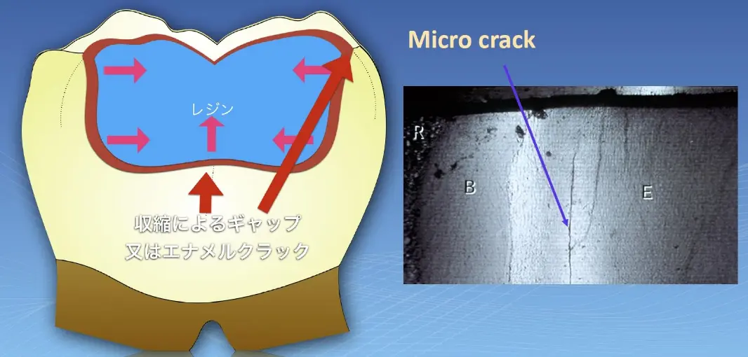 その理由は、レジン*1を最後に光で固める際に収集が起き、隙間*2を埋めようとレジンに健康な歯*3が引っ張られてひびが入ってしまうためです。