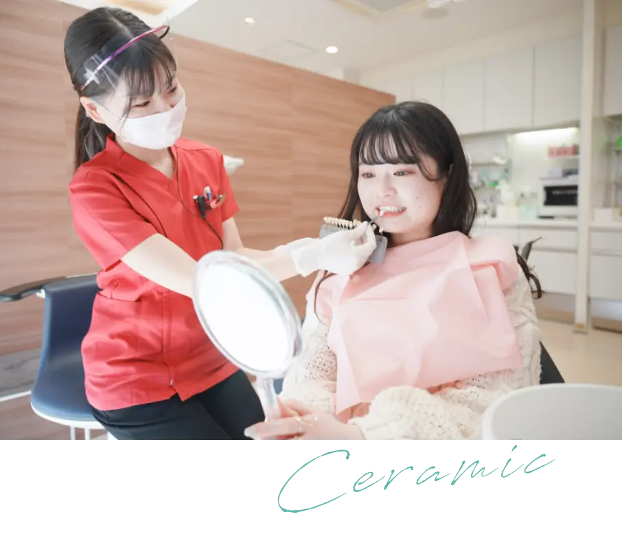 「セラミック」と呼ばれる素材を使用して治療を行うため、