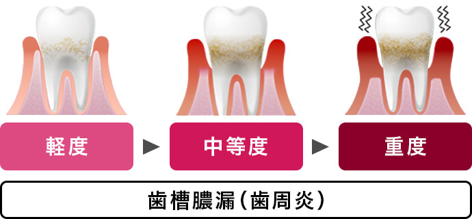 「歯槽膿漏」という言葉は昔から一般的に使われていますが、歯槽膿漏とは、歯周病が重度まで進行した状態を指します。