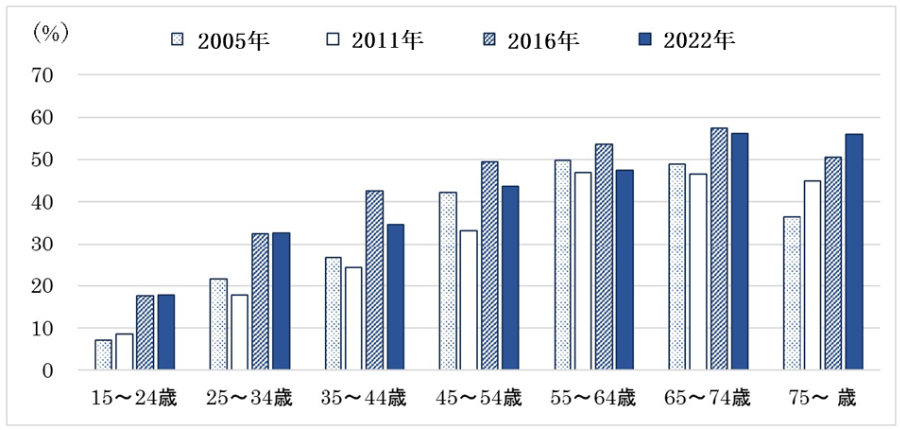 全国の2,097人を対象にした調査では、歯周病の基準となる「歯周ポケットの深さが4mm以上ある人」の割合は、全体の47.9%を占めました(※1)。また、年を重ねるごとに歯周病の感染率は増え、75歳以上の方の感染率は年々増加傾向にあります(図1)。