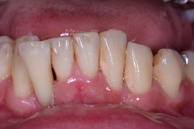 歯槽膿漏によって歯槽骨が溶け、歯茎が下がることで、歯が長く見えています。また、露出した歯根の周りには歯石が付着し、歯茎が腫れているのが分かるでしょう。歯槽骨が吸収されることで、歯がぐらつき、歯並びの悪化も招いてしまいます。