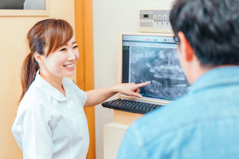 インプラント治療は人工歯根を顎の骨に埋入するための外科手術を行うため、この治療前の検査は非常に重要。健康状態はもちろんのこと、口腔内の状態なども細かく確認していきます。