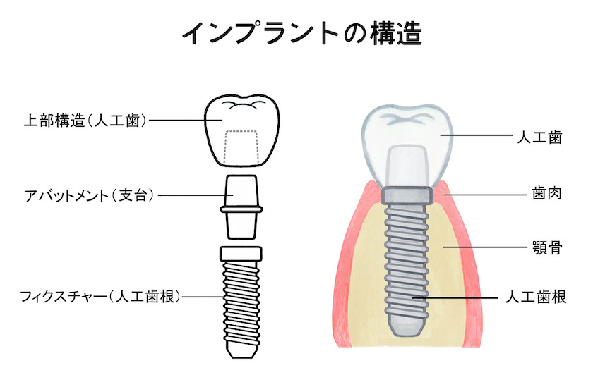 インプラントは「上部構造(人工歯)」「アバットメント(支台部)」「フィクスチャー(人工歯根)」の3つで構成されています。