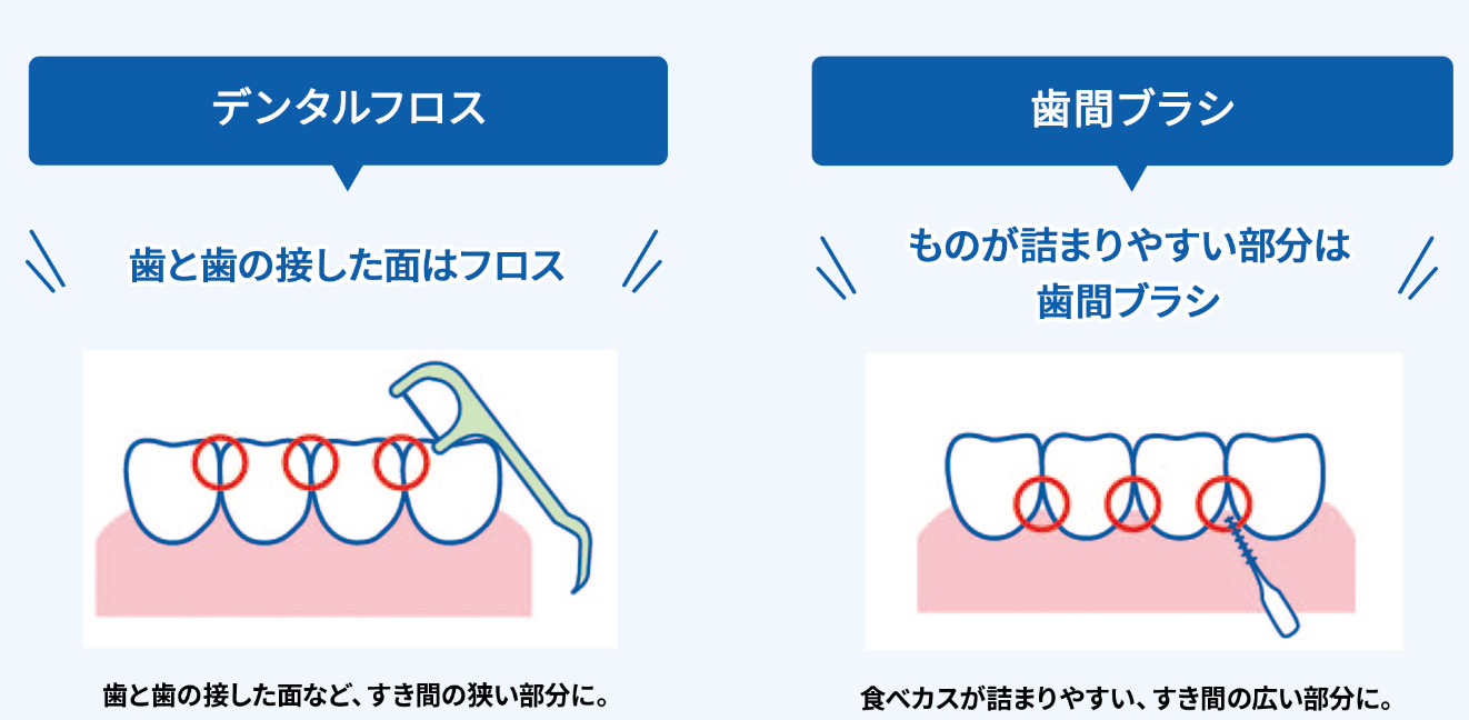 歯と歯のあいだのプラークは、歯ブラシだけで除去することは困難なので、フロスや歯間ブラシも必ず使用しましょう。使用する際の具体的なポイントは以下の2つです。