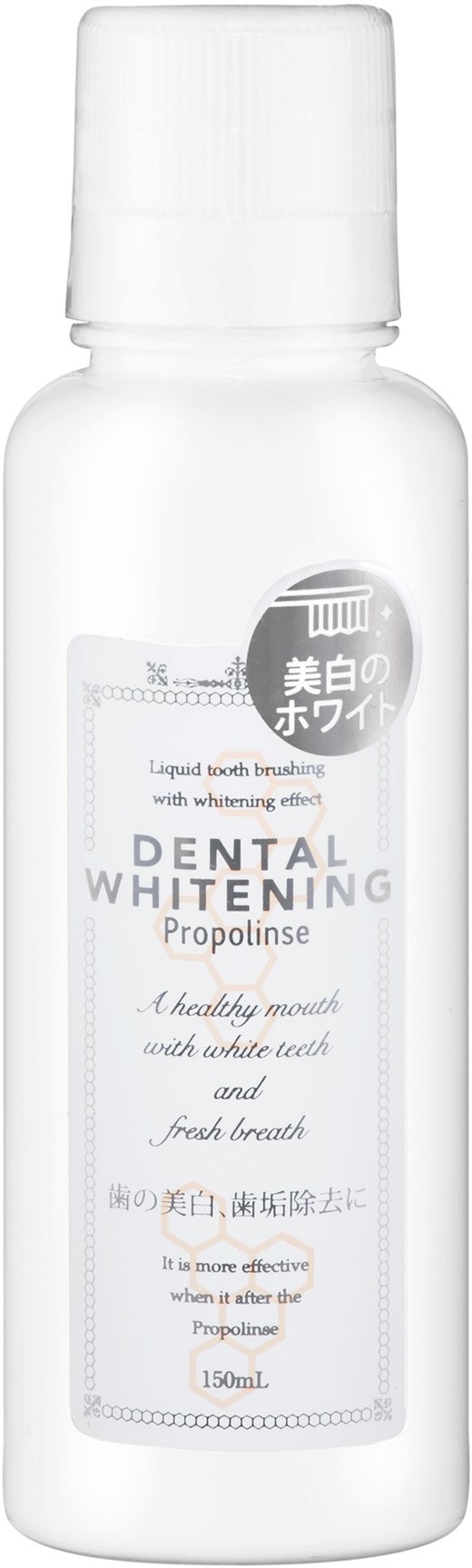 「プロポリンスデンタルホワイトニング150ml」は、歯の表面のヤニ汚れや色素沈着を、ブラッシングにより、ホワイトパウダー(炭酸水素ナトリウム)とフィチン酸の作用で落としやすくする液体はみがきです。