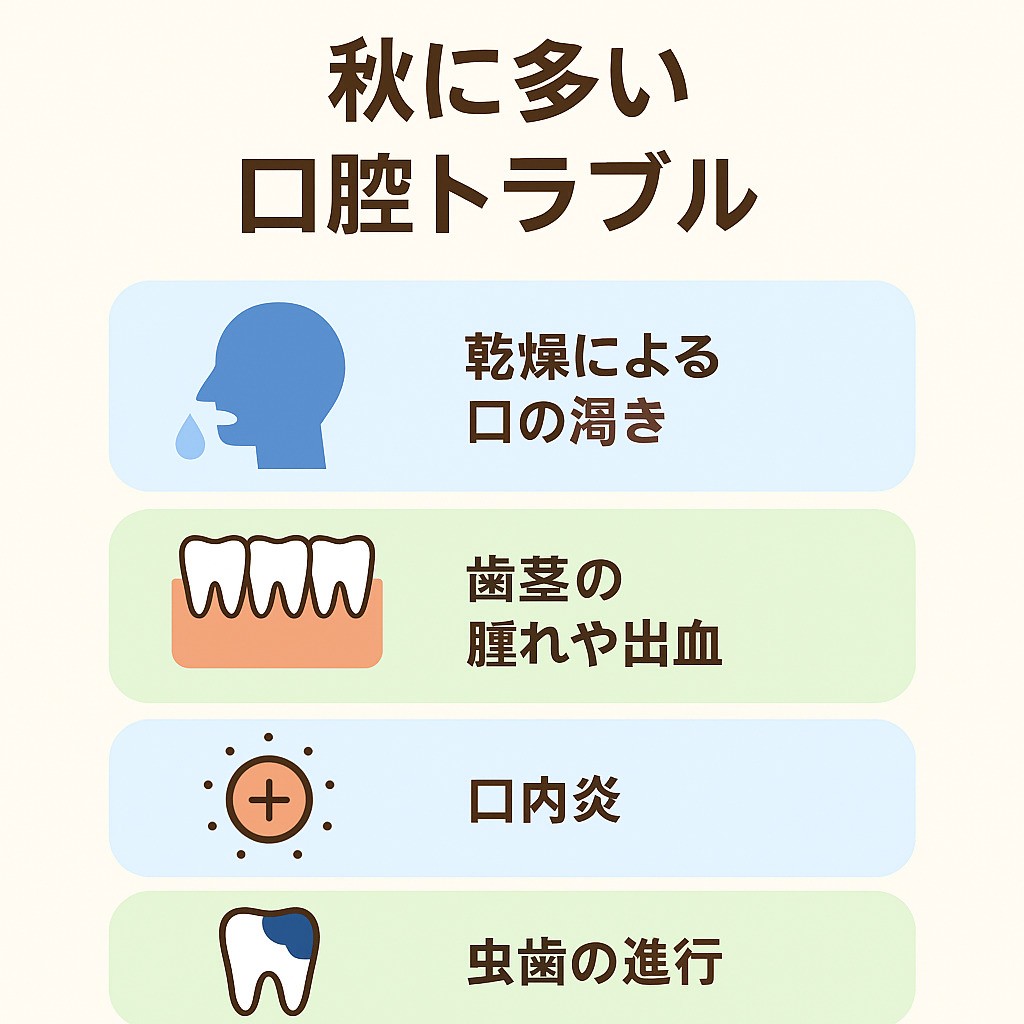 秋は乾燥や食生活の変化に加え、夏の疲れからくる免疫低下も重なり、口腔トラブルと口臭が悪化しやすい季節です。