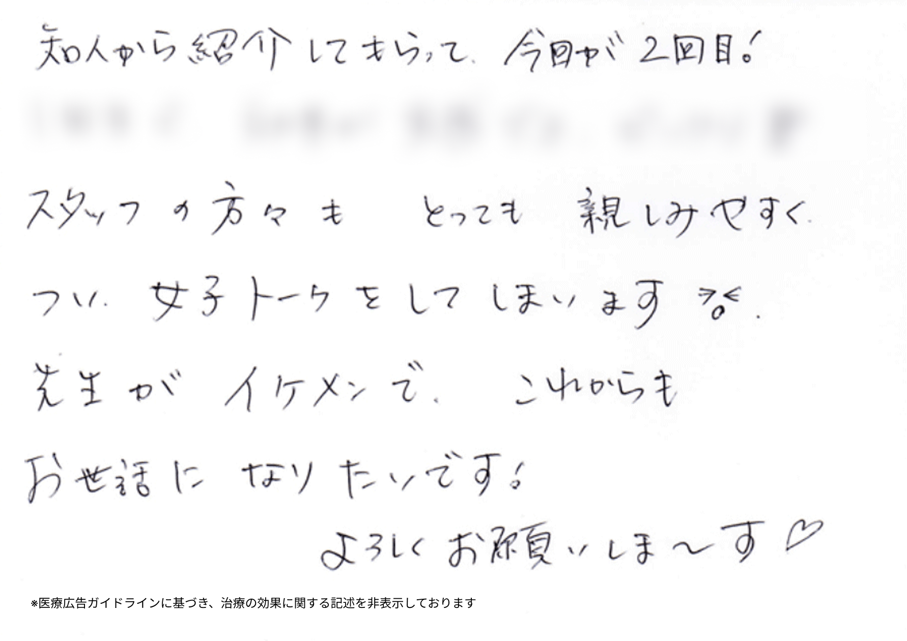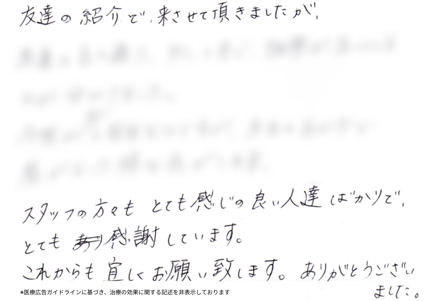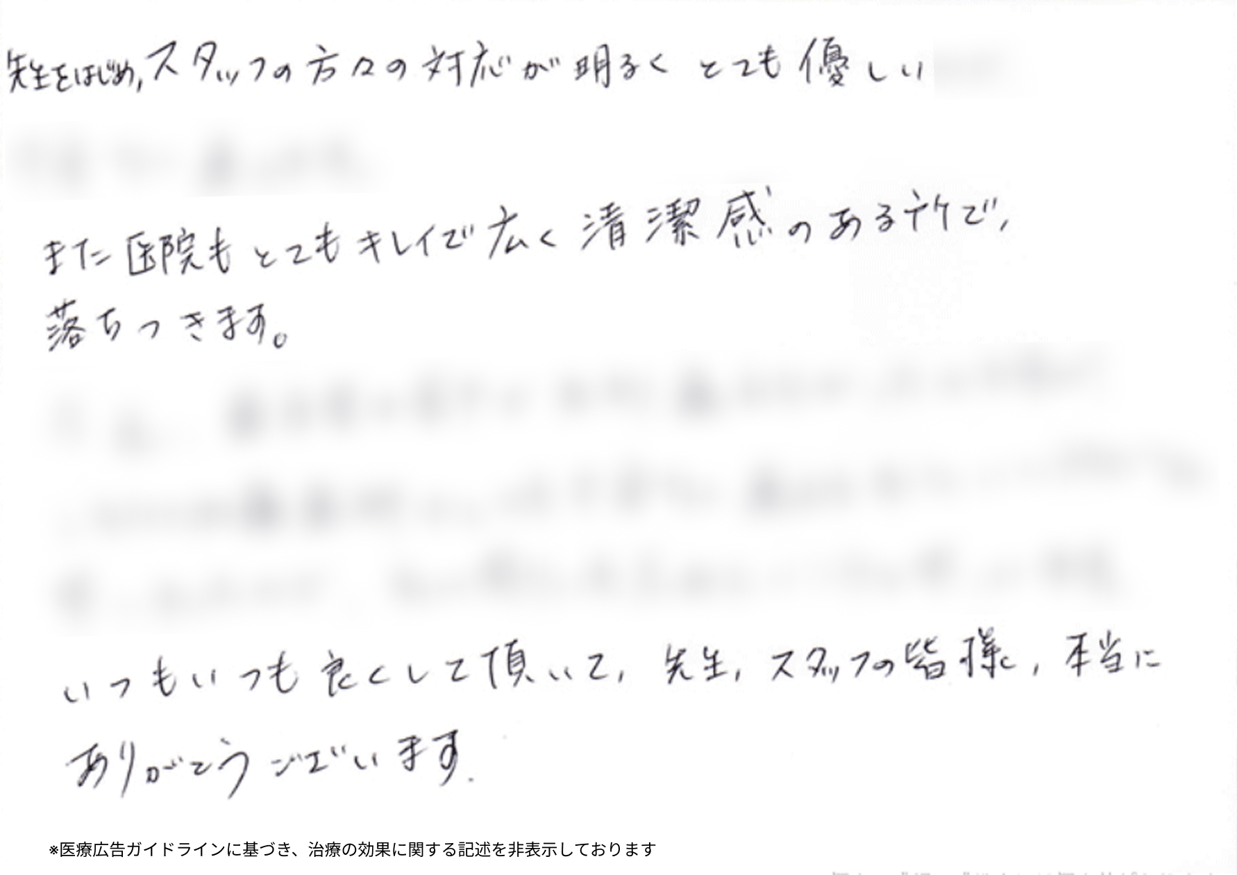 スタッフの対応が優しく、院内も清潔で落ち着きます