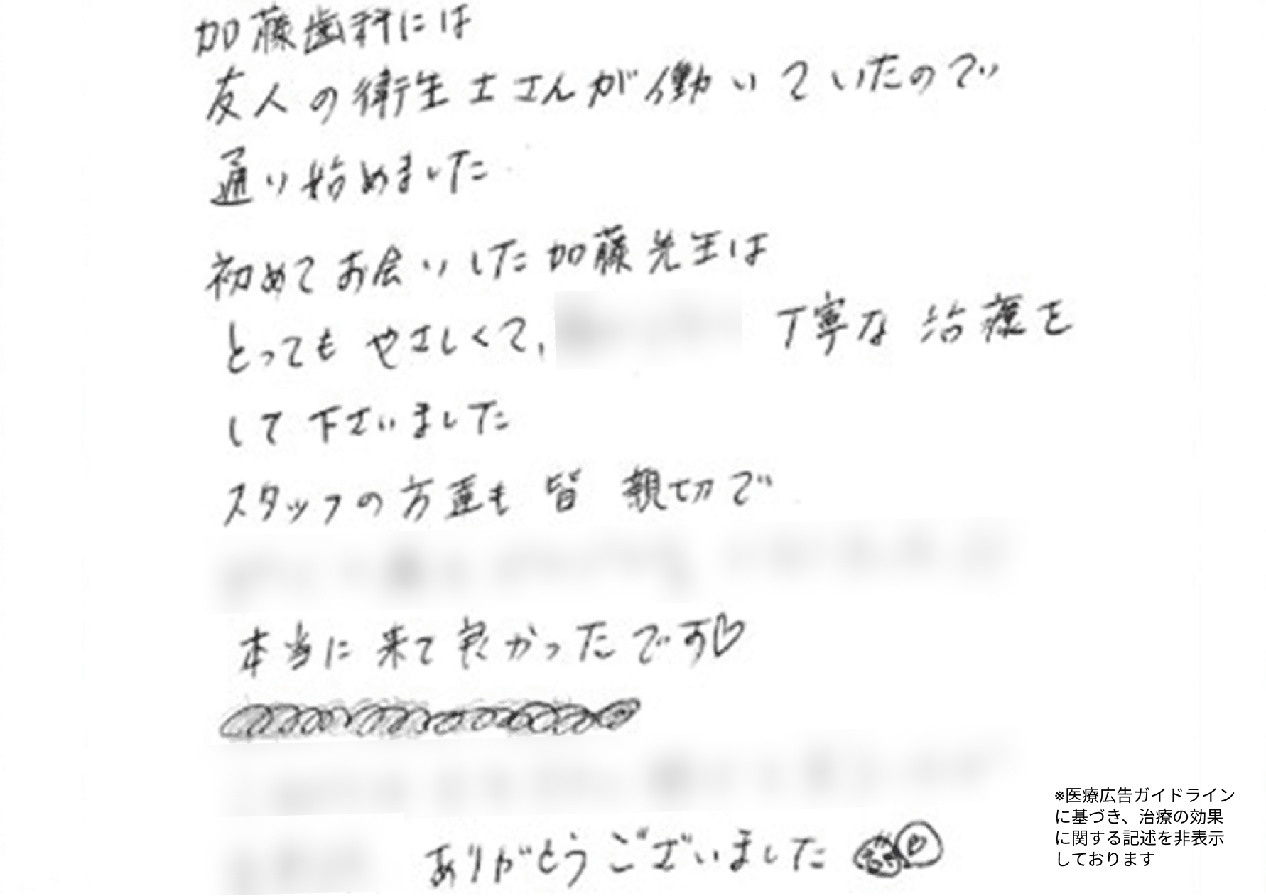 加藤先生はとてもやさしく、丁寧な治療をして下さいました。