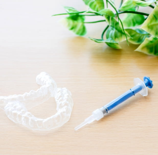 ご自宅で専用トレーとホワイトニング剤を使用してホワイトニングを行います。このホワイトニング剤は、日本人の歯に適した成分で作られているため、知覚過敏を最小限に抑えながら、ホワイトニング効果を最大限に引き出すことができます。1クールは2週間で、ご希望に応じて2クール行うこともできます。