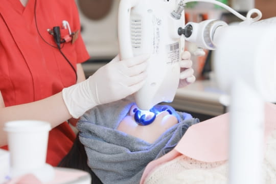 オフィスホワイトニングを開始します。痛みが少なく、効果が最大限発揮できるビヨンドホワイトニングを使用します。歯の状態を細かく確認しながら、1回10分ずつ2~3回繰り返して、歯を白くしていきます。