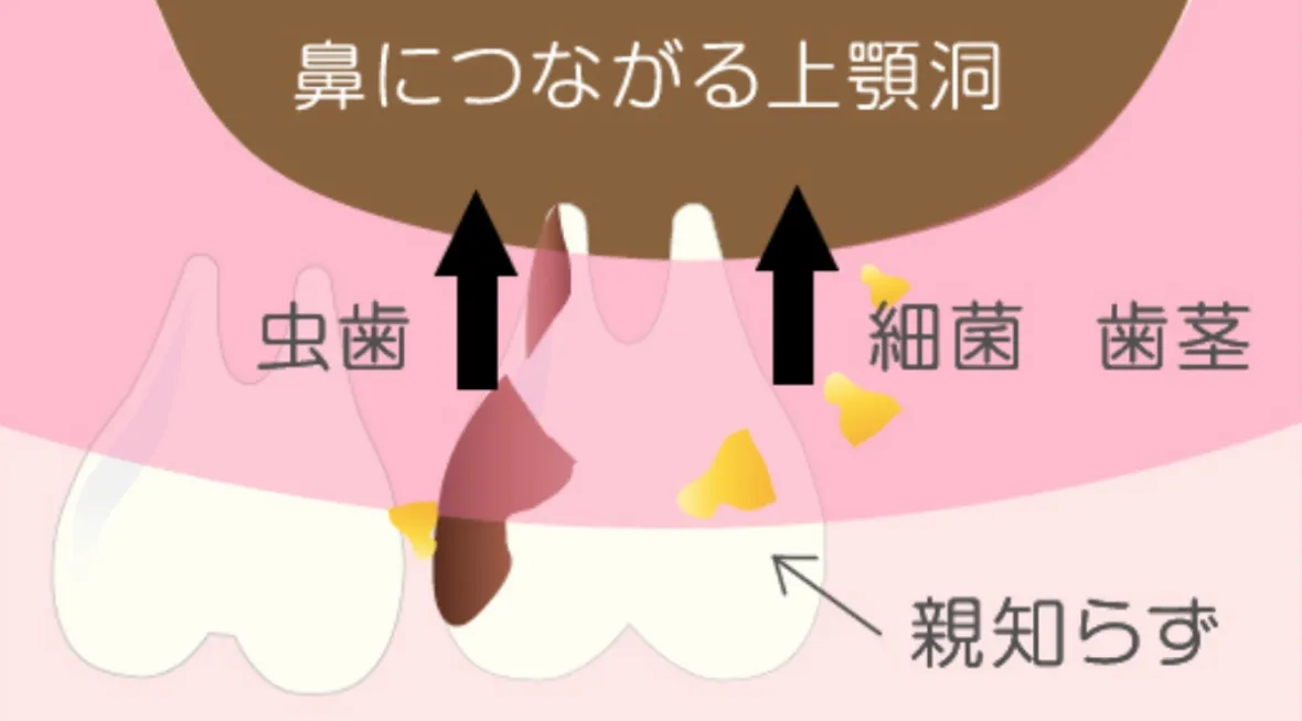 歯の根が深い位置にあると、上顎洞(じょうがくどう)という鼻につながる空洞に近くなり、この状態で虫歯や口内の細菌の感染があると、歯が原因の蓄膿症 (ちくのうしょう)になり、鼻の手術が必要になる事があります。